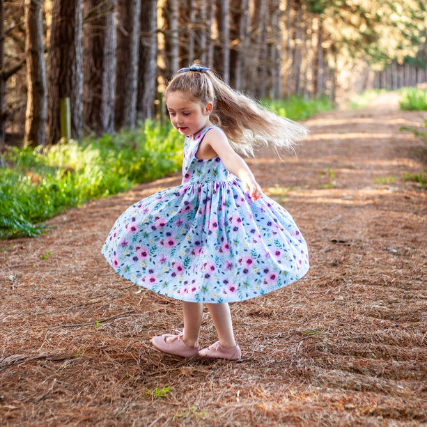 This dress is known as the Alexa Dress.' It has a fitted bodice and a full twirly skirt that your little ones will love.