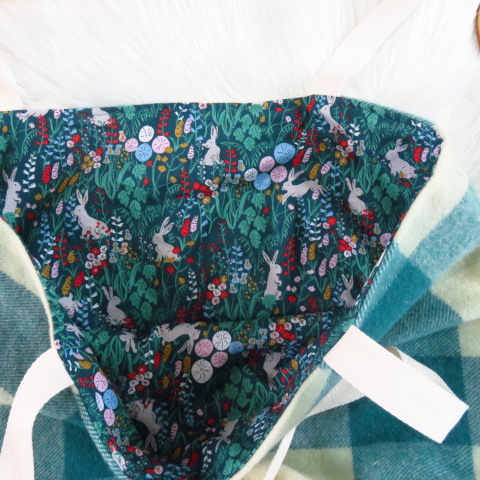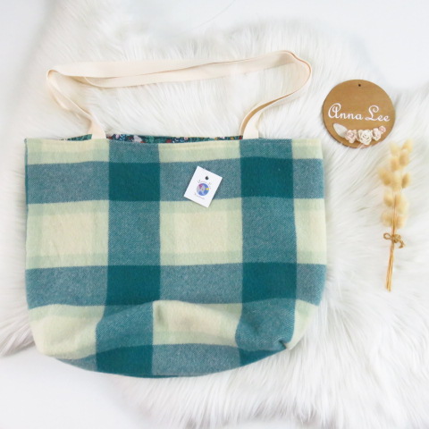 This is a generous sized tote bag made with a repurposed wool blanket outer and a 100% cotton liner. The bags are reversible if you prefer to have the cotton side out for a different look.